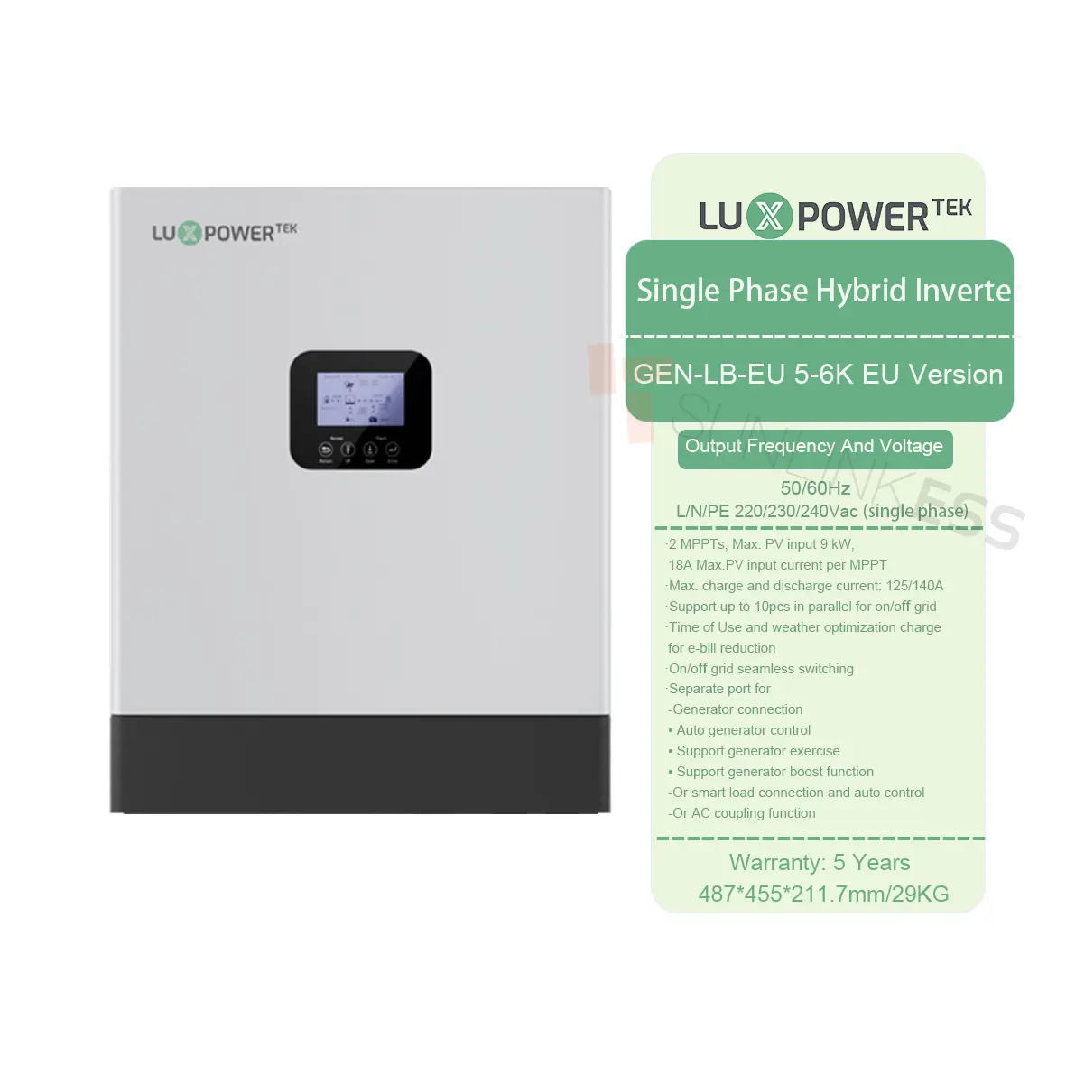 Sunlinkは、LuxPower Gen-LB-EU 5-6Kシリーズを紹介します。これは、費用対効果の高い信頼できる太陽ソリューションを求めるソーラー愛好家向けに設計された高度なハイブリッド単相インバーターです。お問い合わせを歓迎します!