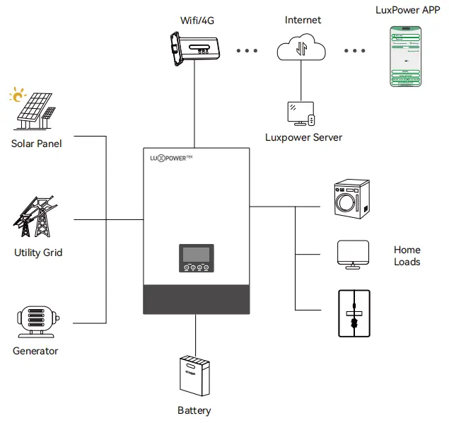 LuxPower SNA6000 Off-Grid Inverterは、DC-DCコンバーターシステムをサポートし、信頼性の高いバックアップパワーまたはディーゼルジェネレーターの交換として機能します。並列機能により、システム容量は6kWから96kWまでのスケールを使用します。インバーターはDC-DCコンバーター作業モードをサポートします。