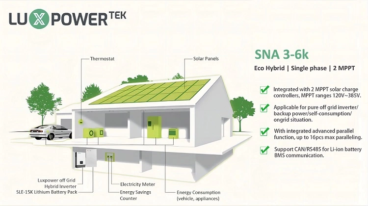コンパクトで簡単にインストールでき、費用対効果の高いLuxPower SNA 6000シングルフェーズインバーターは、エネルギーの心配から簡単に解放されます。並行して最大16%の16%をサポートすると、このソリューションにより、5kWから96kWのモジュラースケーラビリティが可能になり、多様な電力要件が満たされます。