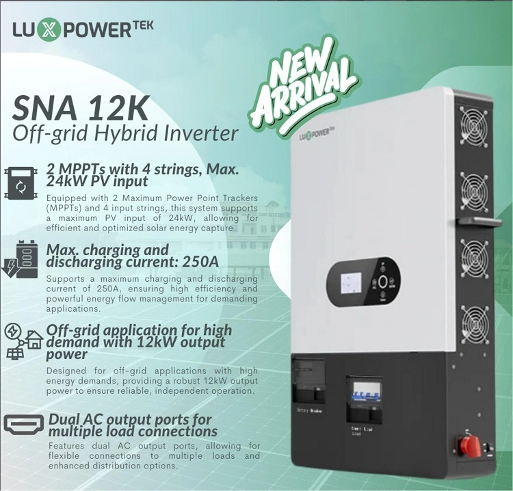SunlinkのLuxPower SNA-EU 12000モデルであるOff-Grid Power SolutionsのLuxPower最新のブレークスルーは、堅牢な出力12kWを提供します。信頼性と汎用性のために設計され、さまざまなアプリケーションでシームレスなエネルギー管理を提供します。