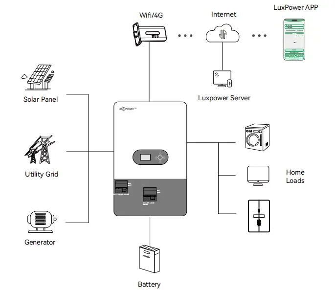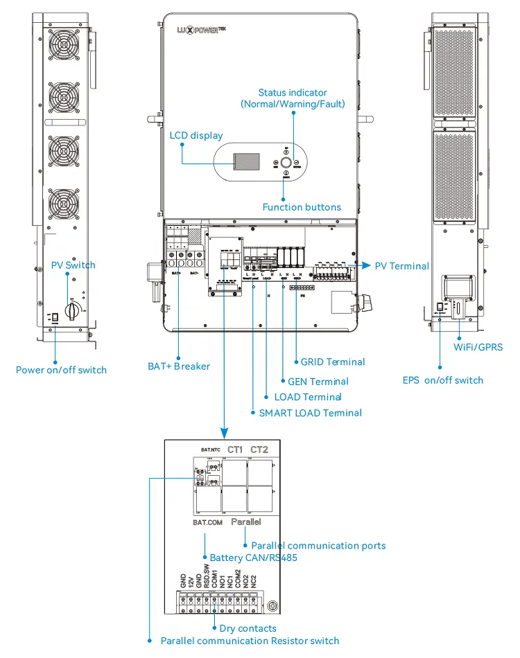 そのモジュラー設計は、最大16ユニットの並列接続をサポートし、多様なエネルギーニーズを満たすためにスケーラビリティを強化します。半波負荷をサポートする独立した負荷ポートを装備しているため、さまざまな負荷要件を処理する際の優れた機能が示されています。 LuxPower SNA-EU 12000は、100Aパススルー機能と専用のジェネレーターポートを備えており、既存のオングリッドシステムとのシームレスな統合を可能にします。