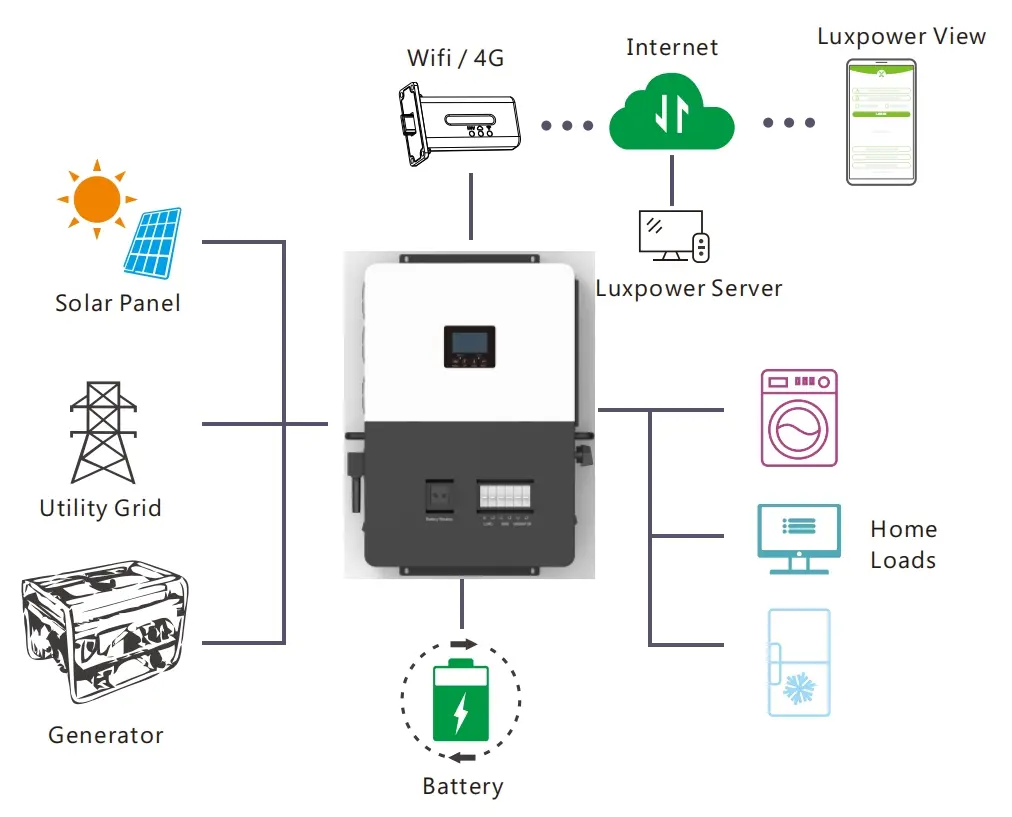 新しい次元を発表するLuxPower SNA US 6000インバーターは、グリッド接続の使用に限定されるだけではありません。また、グリッドと併せて電力を供給するための自律発電を提供します。このデュアル機能は、さまざまな電源条件がある地域に対応し、グリッド接続モードとオフグリッドモード間のスムーズな遷移を可能にします。これにより、遠隔地や不安定な電源を備えた場所にとって理想的なソリューションになり、直接オフグリッドの使用率が可能になります。